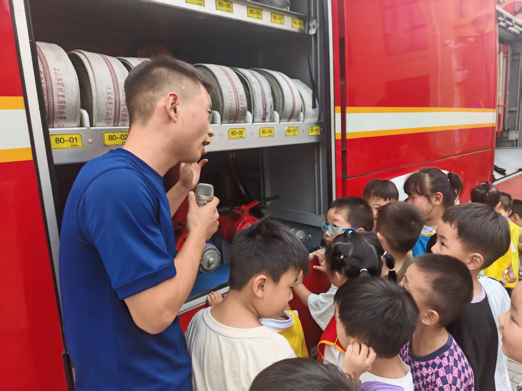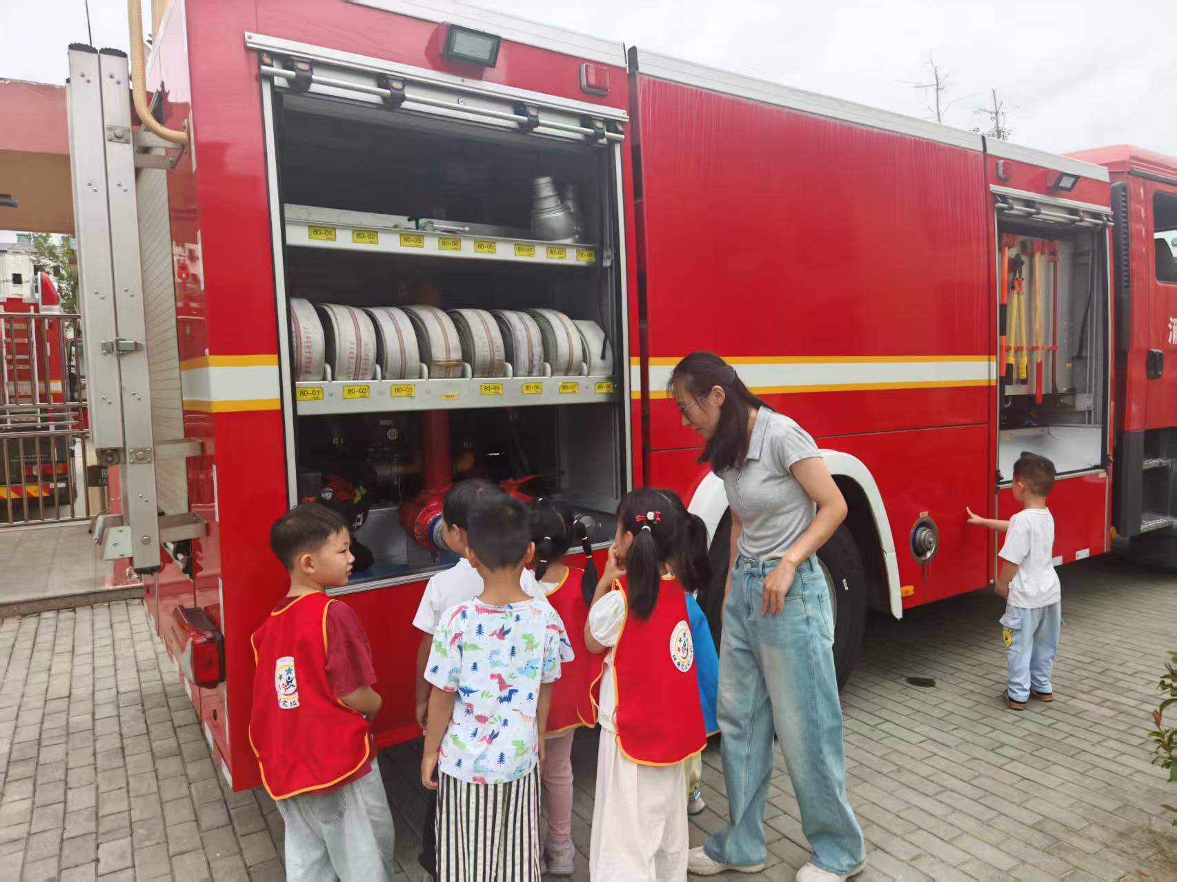最让孩子们兴奋的是近距离参观消防车的环节。高大的红色消防车像一座神秘的堡垒,消防员耐心地打开车上的一扇扇门,向好奇的孩子们展示了车内的各种装备器材,如高压水枪、消防水带、破拆工具等,并简要讲解了它们的用途。孩子们睁大了眼睛,认真聆听,不时发出阵阵惊叹。